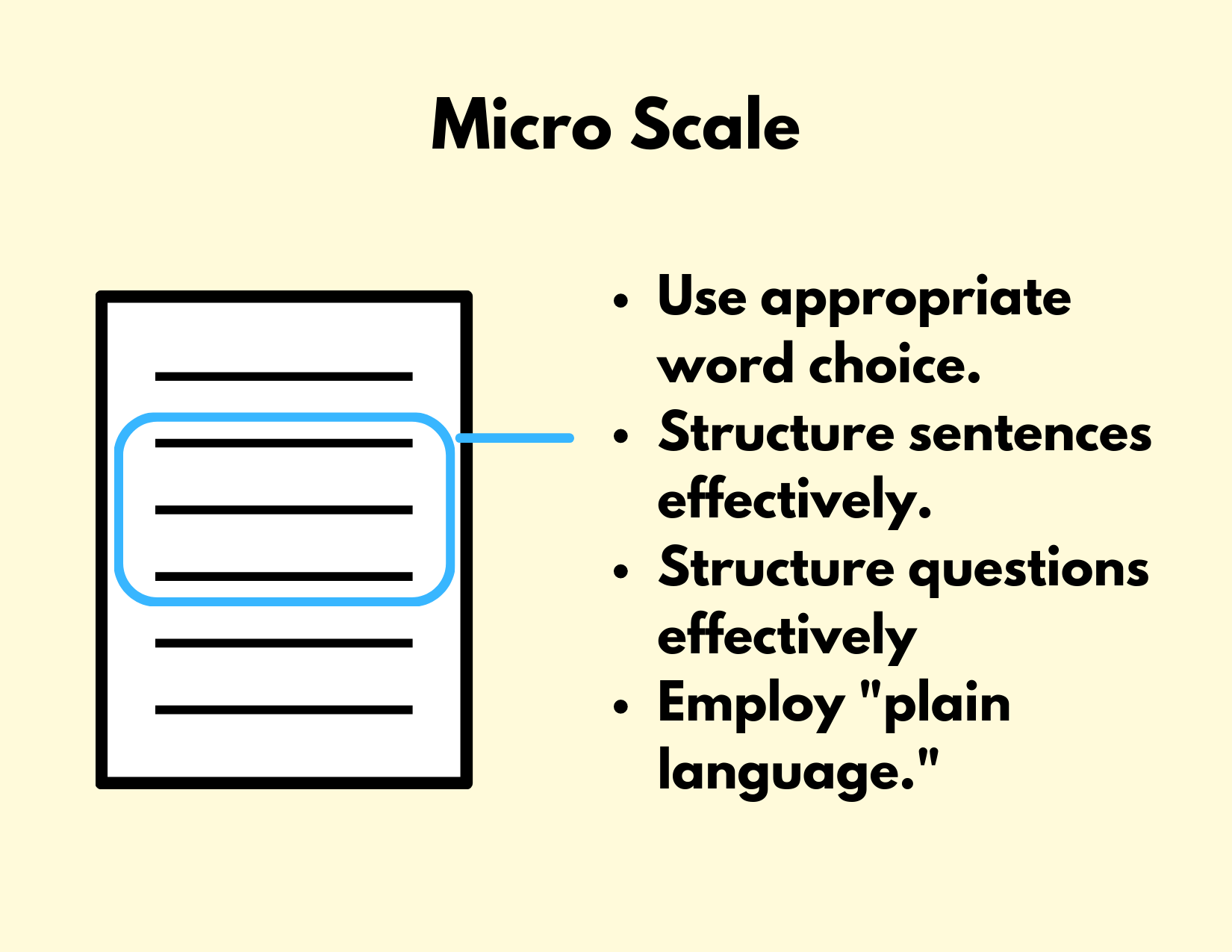 At the Micro Scale, we are addressing the smallest, most detailed scale. Issues at this scale may involve word choice, sentence or paragraph structure. We may need to carefully design a specific question to effectively present legal requirements. The Micro Scale is often what people are referring to when they say “plain language,” though as we will see later, there is a great deal more to this scale than using simple words.