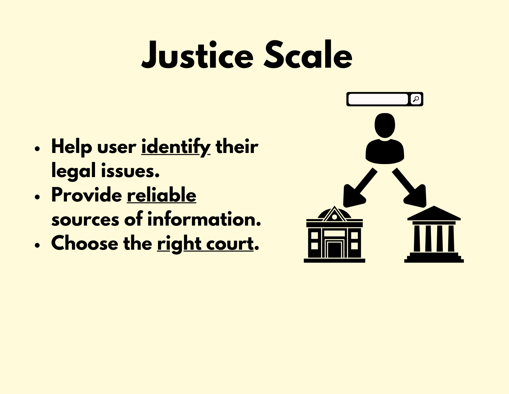 At the Justice Scale, a user with a problem recognizes that their problem involves legal issues. They identify resources to assist with their legal issues, and choose a forum to address the problem.